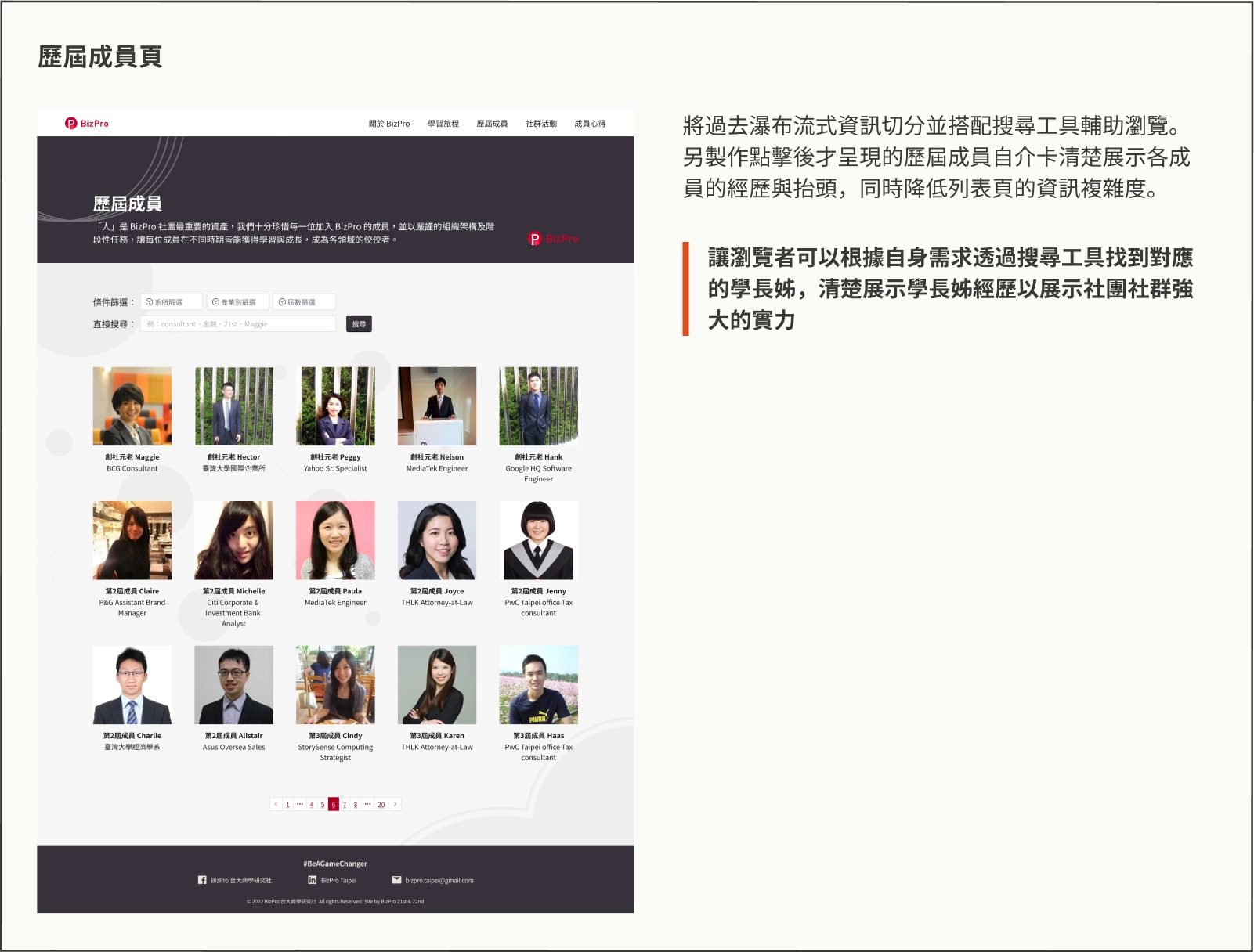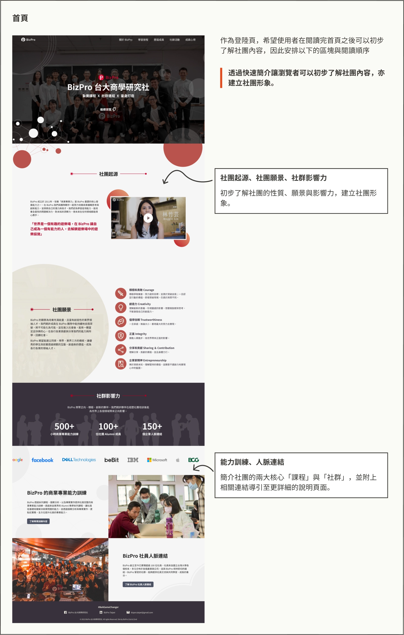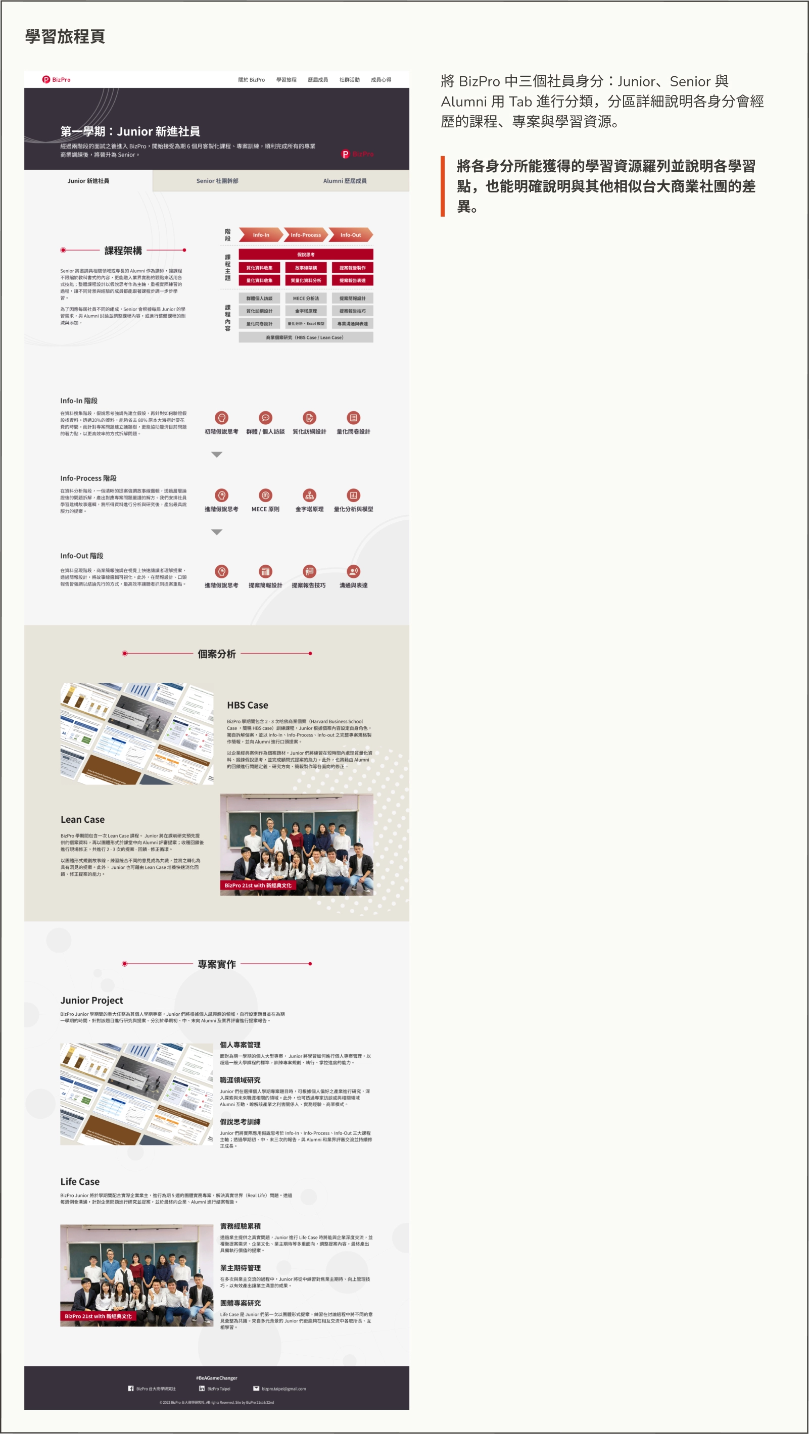 本專案是為 BizPro 台大商學研究社進行的網站重設計,為我擔任幹部期間的個人專案。由於網站自 2014 年建立後,隨著社團成長與課程調整,內容已不符合現況,一頁式設計也使歷屆人員列表過長,影響閱讀體驗。此外隨著台大其他商業社團的崛起,突顯社團價值與課程差異也變得更加重要。