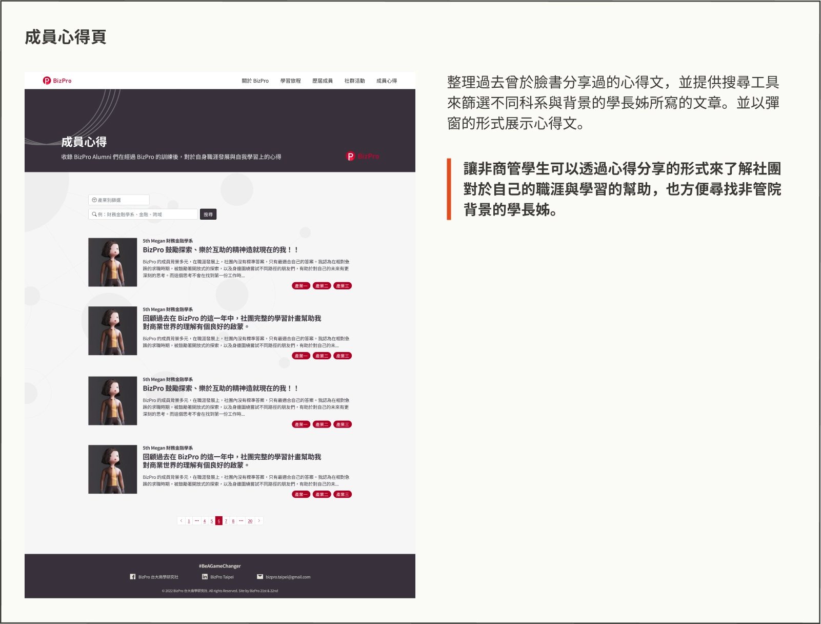 協助 BizPro 台大商學研究社的重新設計網站與後續開發,改善資訊易讀性並突顯社團價值。